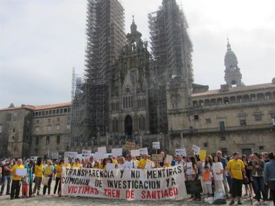 Varias decenas de víctimas y familiares de afectados por el accidente del tren Alvia en el barrio compostelano de Angrois, que cumple este jueves 24 de julio su primer aniversario, se han concentrado en la Praza do Obradoiro para exigir "verdad, justicia y no más mentiras".