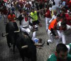 Un toro de la ganadería de Miura ha provocado escenas de pánico en el último encierro de las fiestas de San Fermín tras caer en la curva de Estafeta y quedar descolgado de la manada