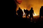 Los manifestantes lanzan adoquines, botellas, latas y otros objetos contundentes la noche de este viernes a los antidisturbios detrás de una barricada con contenedores incendiados en plaza Urquinaona de Barcelona.